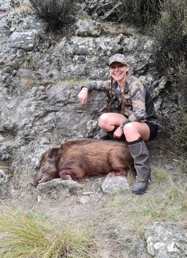 However, my first opportunity did not quite play out this way. Greg and I had covered a fair bit of area at the south end of the block this day and we were headed for camp. He was back behind me and had stopped to glass an adjacent face. I had carried on past a rock face just ahead of us and dropped down into the start of a tight gut. Movement to my right in the long tussock caught my eye. It was a massive ginger razor-back boar adorned with black spots and would soon across my path. He had the most impressive ‘Mohawk’ that went the full length of his body. I immediately dropped to the ground hoping not to be spotted. I pulled my phone out from my pocket for some photos…I know what you’re thinking…. where is her rifle. I had placed this on the ground to get my phone out lol. The boar was mooching along without a care in the world heading towards the bush to my left. I looked for Greg to see what I should do as I was not sure whether to take him or not as I knew there was a good stag in the area. But I could not see Greg. Later I was to find out he was at the rocks doing that whisper/yell voice repeating “Kate, take him”. When I finally did hear him, the newly named ‘Boris’ was quite close to the bush edge. I picked up my new 7mm-08 and lined up on him (I was about to again add to my growing toolbox of learnings) and squeezed off a round. A miss, I couldn’t believe it. The shot felt bang on. Unfortunately, this was a new rifle with a new scope that had adjustable turrets which I had never used before. Over the day, taking it on and off my shoulder, I must have knocked the dial and taken it off zero which sent the shot high. Lesson learned as I watched his butt disappear into the manuka scrub. Greg went in for a look, but he was nowhere to be seen. Many a laugh has been had over this day.
