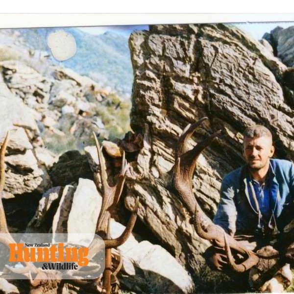 G. G. Atkinson’s two magnificent Cataract Creek 1938 trophies from the like never seen before. The colours show in rich detail his heads, .303 rifle and binoculars. Left is a 17 pointer 39 inches in both spread and length. Right is known as one of the most outstanding wild red deer ever shot in New Zealand – 19 points, length 43 ½, width 44 ½, beam 8 ½ inches.