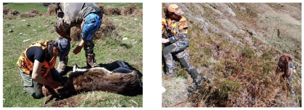 Veronica prepares her kill for the carry back down and leaves it in the shade of the hill.