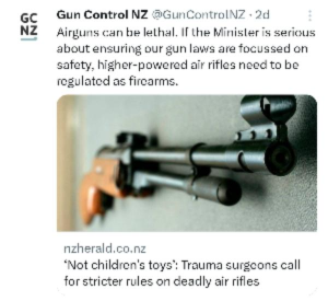The two doctors now want the modern, spring-loaded weapons to be regulated in the same way as other firearms. Gun Control New Zealand were quick to speak in support of further restrictions on air rifles.