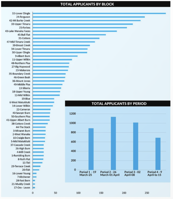 There are a couple of myths and comments that get made about balloting in NZ which were the motivation to produce this work. The first is Overseas residents get issued a lot of the blocks. That is simply untrue. The next is that it's rigged because “I never get anything”. The reason balloting success appears low among NZ hunters lies in the distribution of choices which is truly eye opening. We all pick the same blocks and periods! You can see it clearly in the graphs with four blocks attracting the majority of applications. No wonder none of us hit the jackpot! The probability (as determined by the mathematician) of drawing Ferguson, Lower Dingle, Mt Burke Creek, Forbes and Upper Timaru in the second period is approximately 1%. Another way of thinking about that is that if you balloted 100 times you could expect to receive those blocks once on average. Over a 100 years you may draw Upper Timaru, 2nd period once. That's not great odds, so don't expect a successful application regularly.