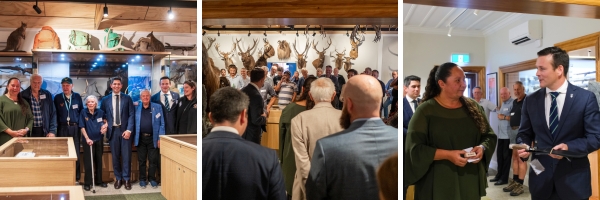 Left: Left: Hon. Minister Nicole McKee with Hon. Minister John Meager. Centre: CEO Gwyn Thurlow and Minister Nicole McKee opening the Gunroom on Friday 14th February 2025. Right: Minister Nicole McKee alongside Sir Mark Dunajtschik.